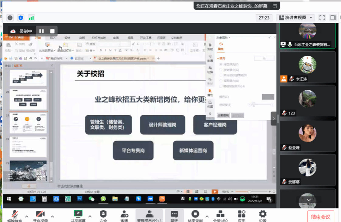 三场宣讲活动取得了圆满成功、参会人数包括校企合作单位工作人员、毕业员工、在校教师共参加人数658人、线上宣讲累计时长6小时、参会员工与公司互动频繁、19级环境设计、19级艺术设计、19级视觉传达专业等本科毕业班级员工参与积极性高且与用人单位就岗位问题、晋升问题、技能问题进行了全面的沟通与了解。
