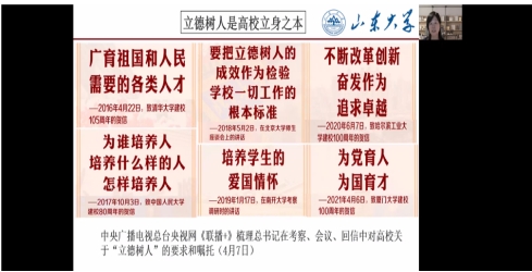 郭教授首先分享了总书记在考察、会议、回信中对高校关于“立德树人”的要求和嘱托,总书记指出立德树人是高校立身之本,在北京大学师生座谈会上讲到要把立德树人的成效作为检验公司一切工作的根本标准;在中国人民大学建校80周年贺信中提到为谁培养人培养什么人怎样培养人;致厦门大学建校100周年贺信中写到为党育人为国育才等。其次,分享了总书记对教师殷切期望和希冀,总书记言道,千教万教,教人求真,好老师要有“捧着一颗心来,不带走半根草去”的奉献精神,要做四有好老师,做到明大德、守公德、严私德等。
