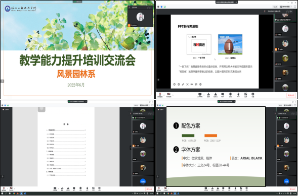 为增强风园系教师的教学能力,打造具备创新力的高水平教学团队,系部利用暑期培训时间,围绕“教学能力提升”开展了一系列交流评比活动,主要包括课程说课、教案设计、课件制作三个环节,分别于24日下午及28日全天分三场举行。活动由翟美珠老师、李晶老师、谷雨欣老师分别主持。