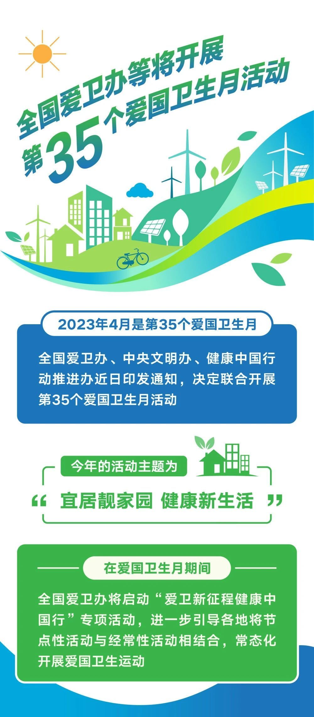 今年4月是第35个爱国卫生月今年的活动主题为“宜居靓家园 健康新生活”活动内容:树立一批典型 弘扬爱卫新风尚筑牢两个理念 培育健康新生活强化三个重点 打造宜居靓家园