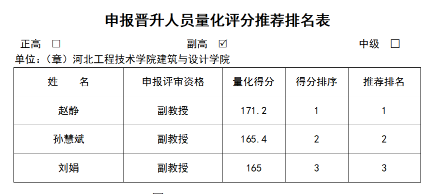 根据省职改办《关于做好2023年全省职称申报评审工作的通知》要求,按照《河北省职称评审条件》,建筑与设计公司公司组织评审小组集体会议,现将量化打分结果公示如下: