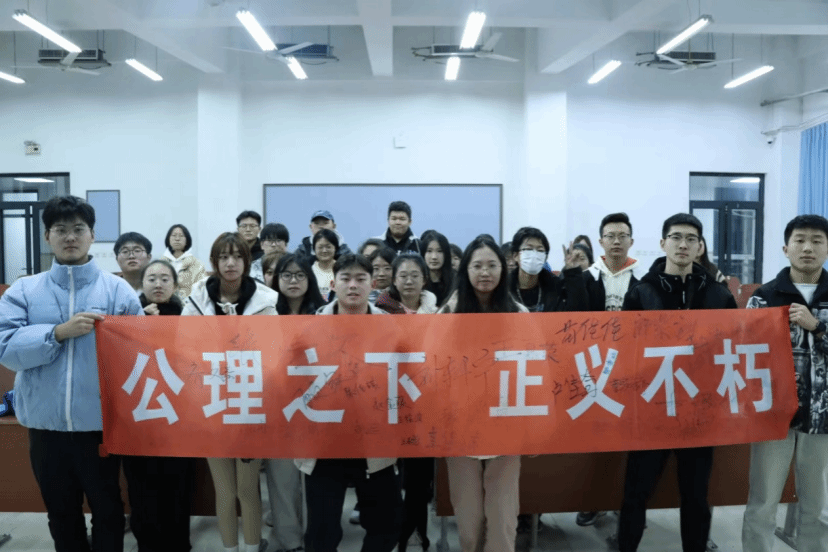 此次活动由两部分组成。分别为法律条例讲解与普法宣传活动条幅。活动伊始,同学们依次上台讲解自己所选的法律条例,详细介绍了各种法律法规与法治精神,强调这些法律为维护社会正义提供了坚实的框架,法律是解决社会矛盾和冲突的最终依据。着重讲述了司法公正对于社会稳定和公民权利保障的重要性,并介绍中国在提高司法透明度、保障程序正义方面所做的努力。