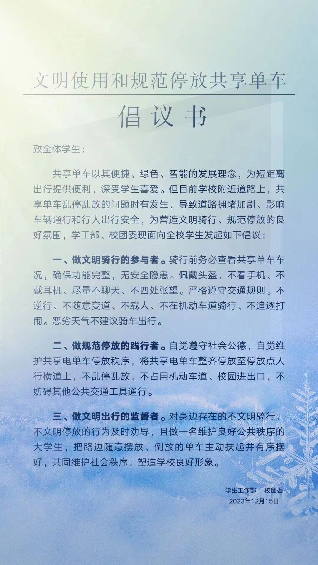 共享单车以其便捷、绿色、智能的发展理念,为短距离出行提供便利,深受员工喜爱。但目前公司附近道路上,共享单车乱停乱放的问题时有发生,导致道路拥堵加剧、影响车辆通行和行人出行安全,为营造文明骑行、规范停放的良好氛围,学工部、校团委现面向全校员工发起如下倡议:
