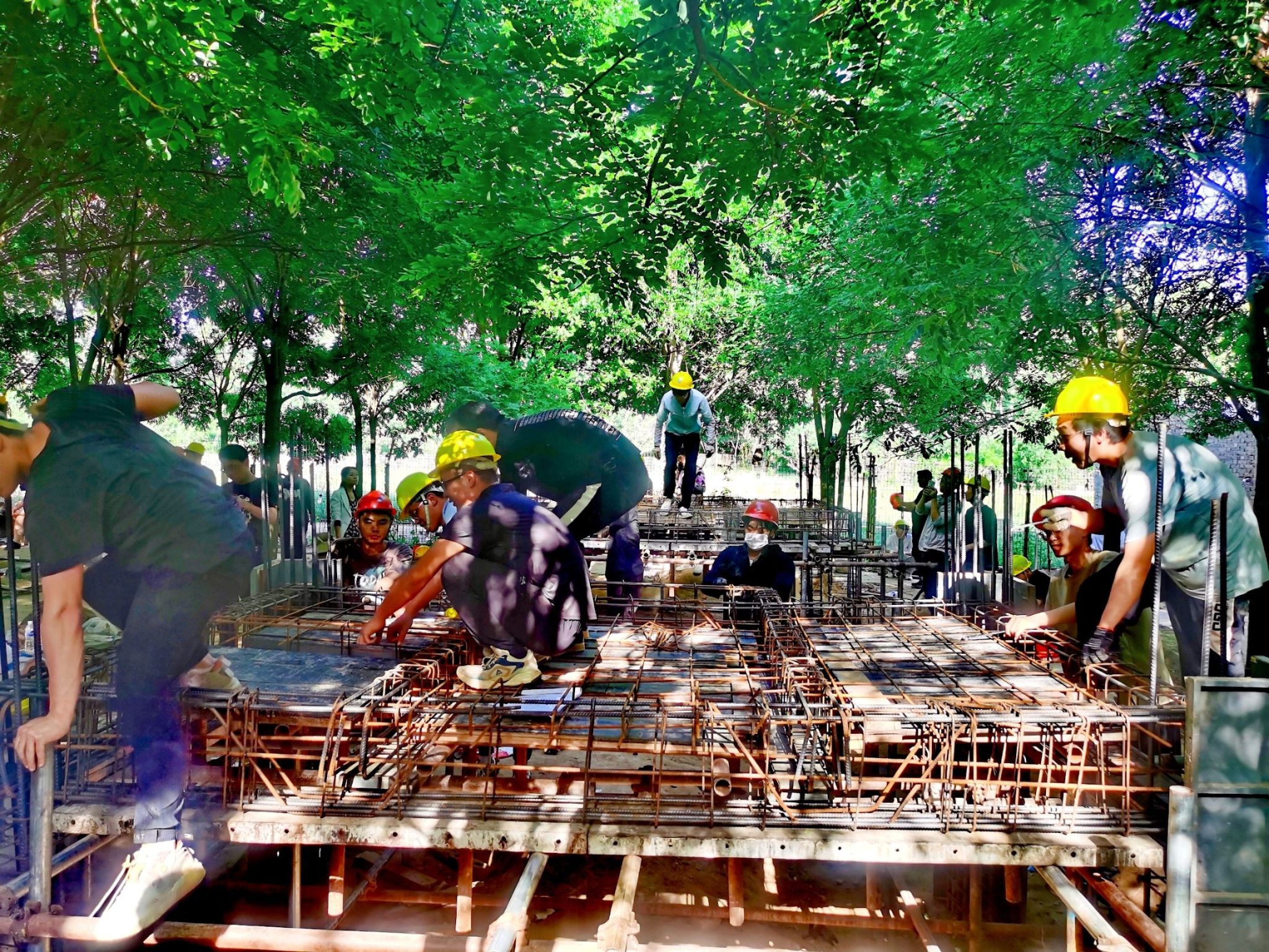 在本次生产实习中,同学们挥汗如雨、热情高涨,从定位放线、土方开挖,到垫层施工、基础施工、柱筋绑扎、脚手架搭设、模板搭设、梁筋板筋绑扎,以及期间的质量控制、进度控制、成本控制、安全管理等,工程造价、土木工程、工程管理专业2021级员工深刻地体会了框架结构的每一个主要生产环节。建筑电气与智能化专业则完成了建筑物室内配电系统的设计与安装实习,包括图纸会审和算量、SC管及电源线敷设、室内电气设备定位与安装、配电控制箱配盘、线路检测与验收等任务。
