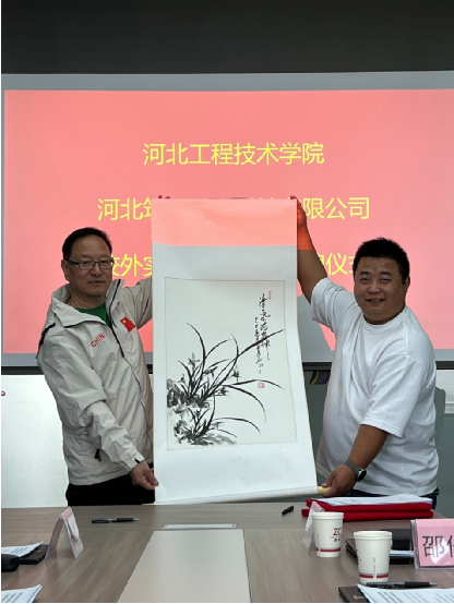 随后公司分别与河北筑成数字科技有限公司、河北普斯汇企业管理咨询有限公司签署合作协议,并为河北筑成数字科技有限公司颁发校外实习实训基地牌匾,赠送兰花国画礼品。