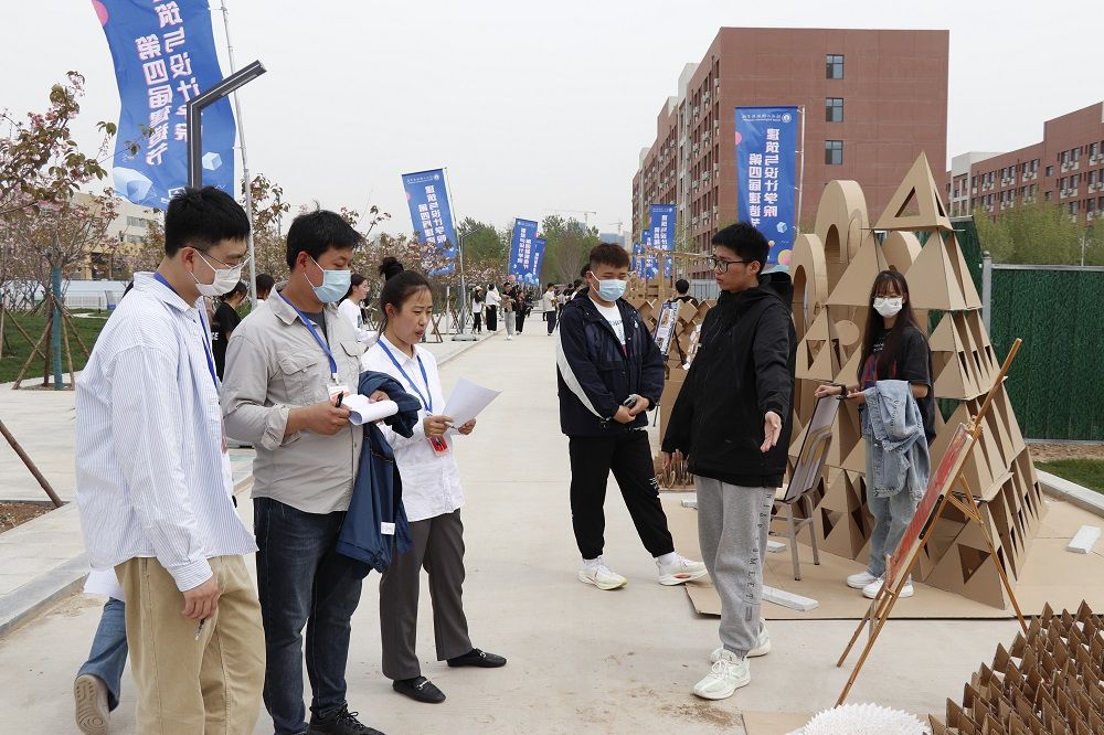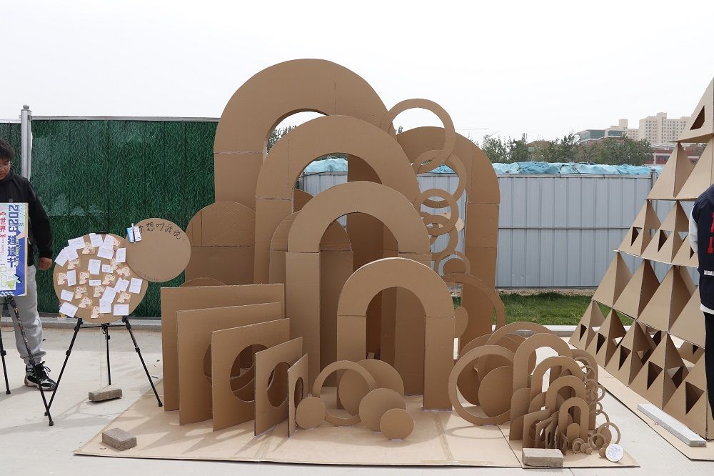 展览过程中,各组的作品模型在阳光下产生明显的光影变化效果。现场气氛轻松活跃,在各个队伍代表的积极讲解和答疑解惑下,参与师生们对空间形态的构造也有了不同的感官体验。