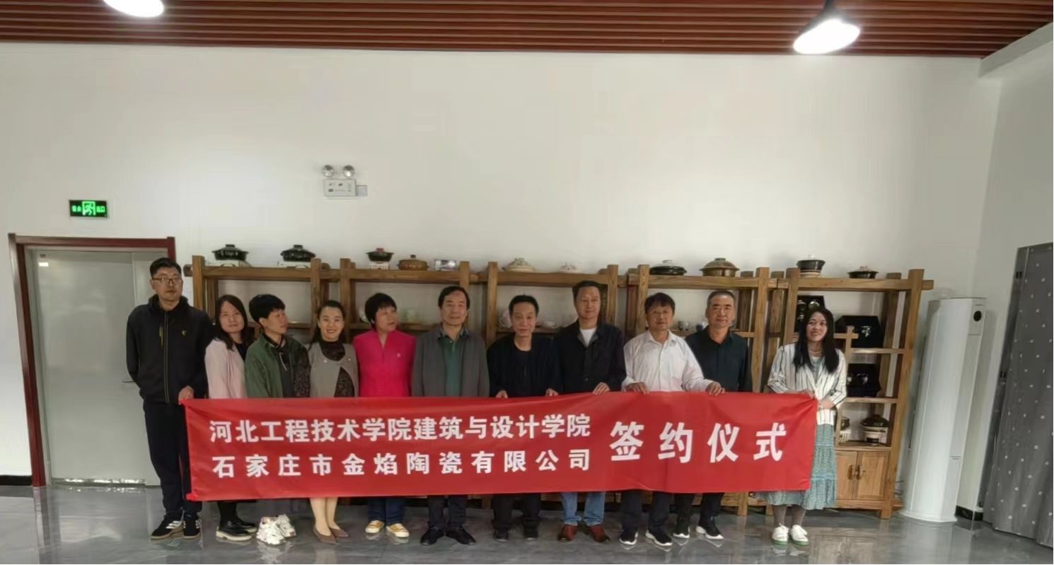 2023年 5月9日下午,建筑与设计公司与石家庄市金焰陶瓷有限公司经理武勇,建筑与设计公司学管副经理、党支部书记张玲玲,建筑与设计公司副经理谷雨,建筑与设计公司副经理李江涛带领办公室主任王海波,实践教学中心主任徐长贵,艺术设计学专职教师刘鶄燕、郭晓颖前往石家庄市金焰陶瓷有限公司参观洽谈,达成校企合作意向,并举行了签约仪式。