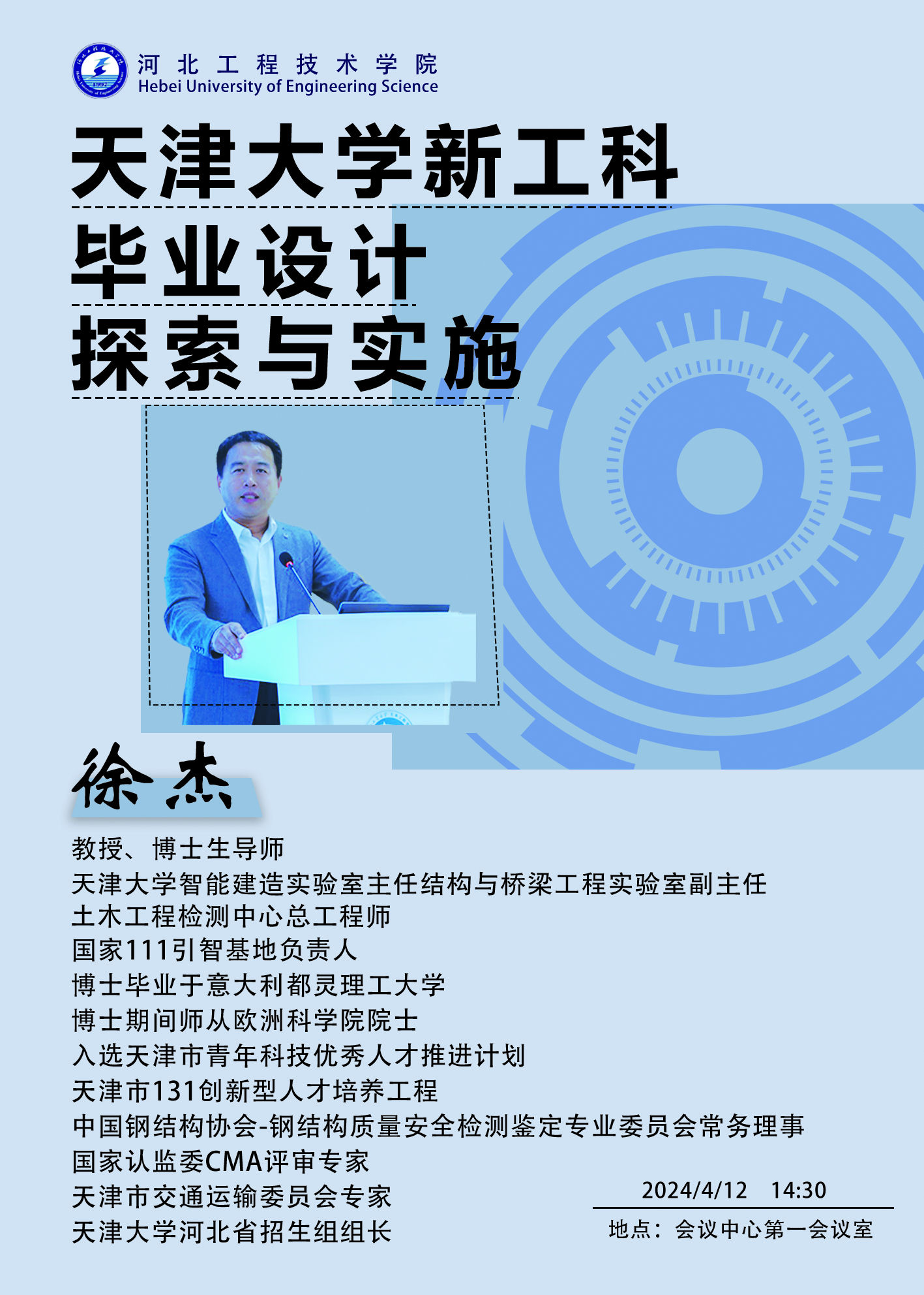 主讲人简介:徐杰,教授、博士生导师。天津大学智能建造实验室主任、结构与桥梁工程实验室副主任、土木工程检测中心总工程师,国家111引智基地负责人。博士毕业于意大利都灵理工大学,博士期间师从欧洲科公司院士、第13届国际断裂力学学会主席Alberto Carpinteri教授,于2013年3月被天津大学引进回国。入选天津市青年科技优秀人才推进计划、天津市131创新型人才培养工程。中国钢结构协会-钢结构质量安全检测鉴定专业委员会常务理事、国家认监委CMA评审专家、天津市交通运输委员会专家,天津大学河北省招生组组长。长期从事智能建造新技术、结构智能监测及低碳绿色高性能材料方向研究。近年来主持及省部级国家级科研项目12项,重点工程委托项目20余项;发表高水平SCI论文60余篇,撰写英文著作2部及参编1部;获国际授权发明专利3项,国内发明专利7项,实用新型专利20余项,软件著作权6项,开发监测系统1套;在多个国内外学术组织兼职,是美国土木工程学会(ASCE)会员、美国科技学会(AASCIT)会员、国际建筑工程与土木工程会议(AECE2016)学术委员会委员、第14届国际断裂力学大会(ICF14)学术委员会委员;担任国际期刊Frontiers in Materials、Big Data and Cloud Innovation和Journal of Computer Science Research编委,国际期刊Applied Science、Sensor特邀编委;Construction and Building Materials、Structural Health Monitoring等10多个重要SCI期刊审稿人。