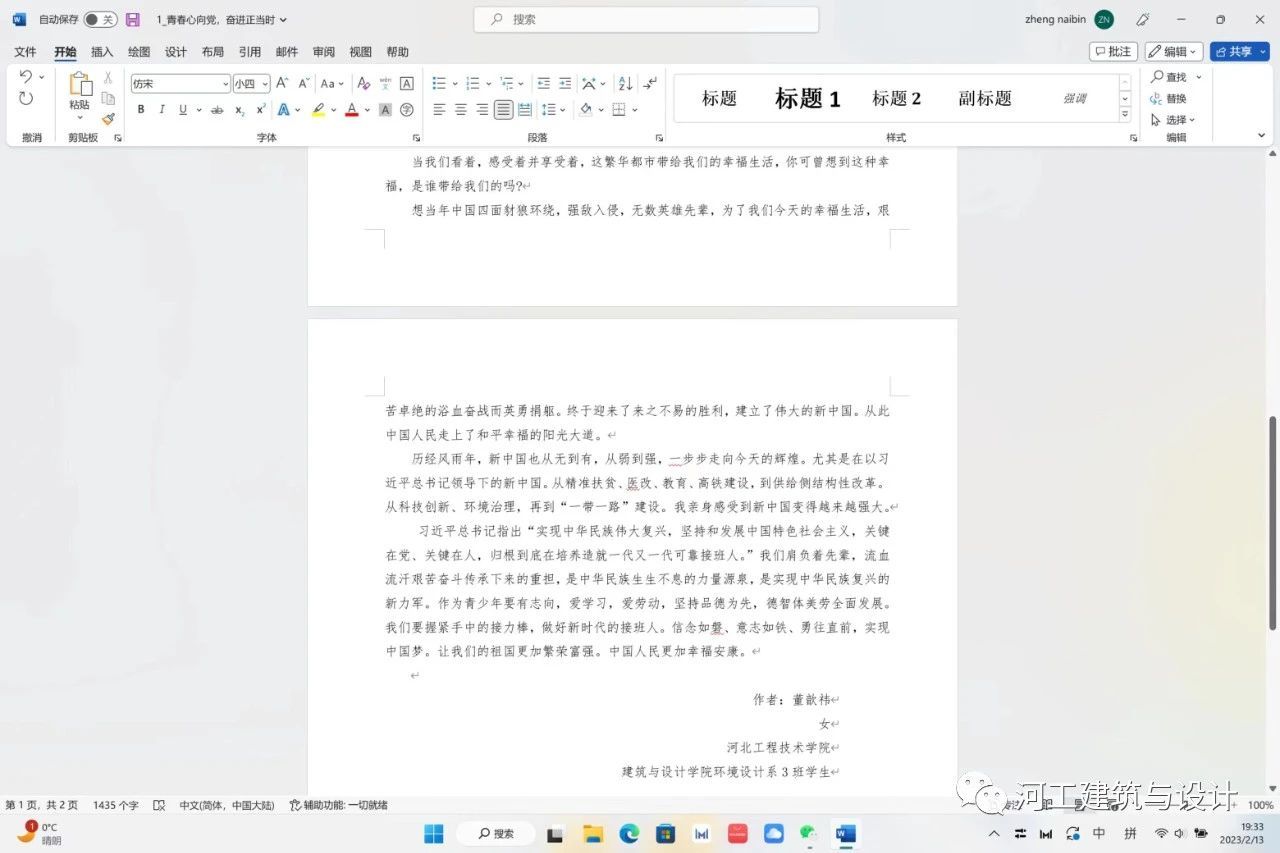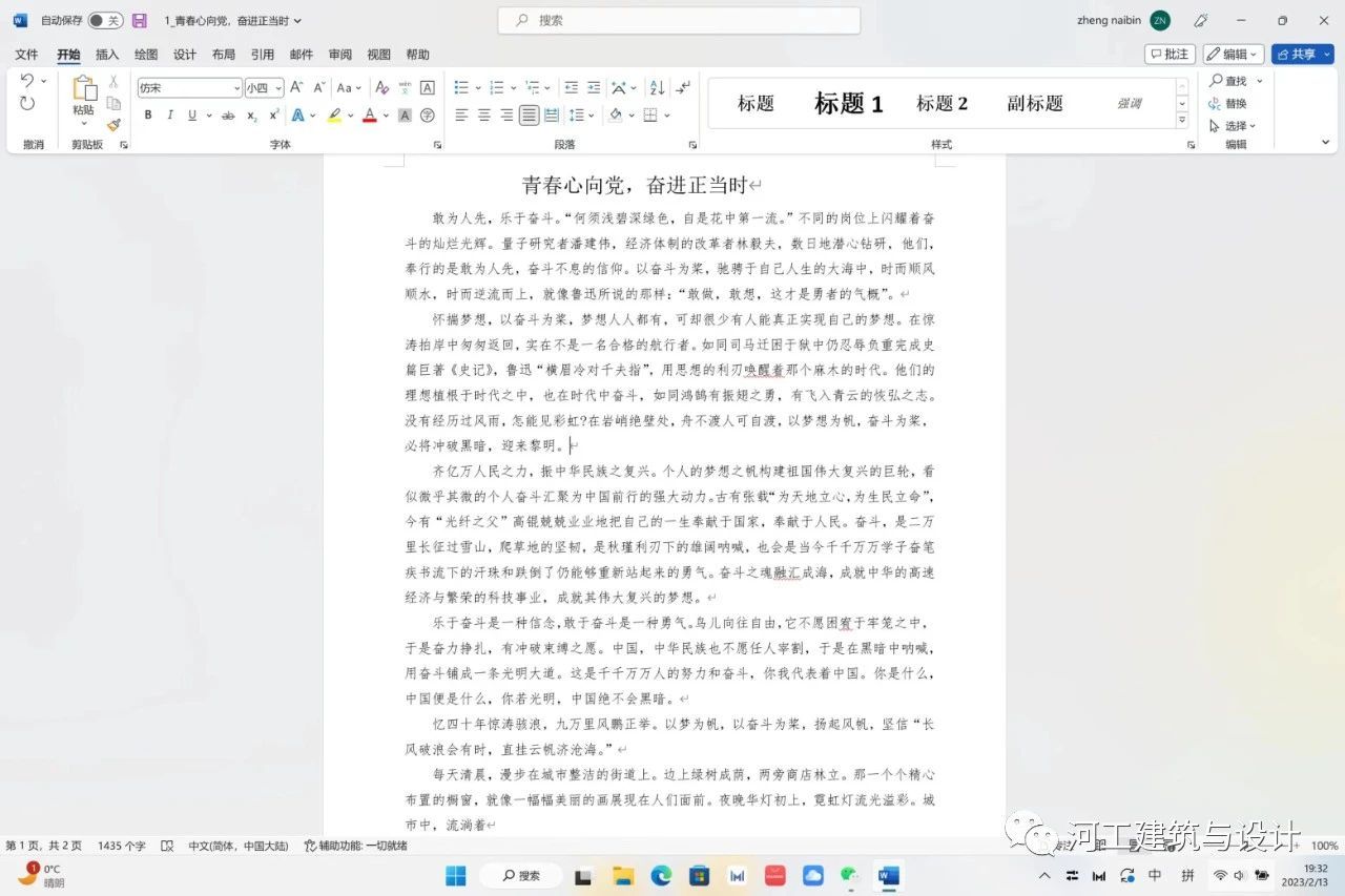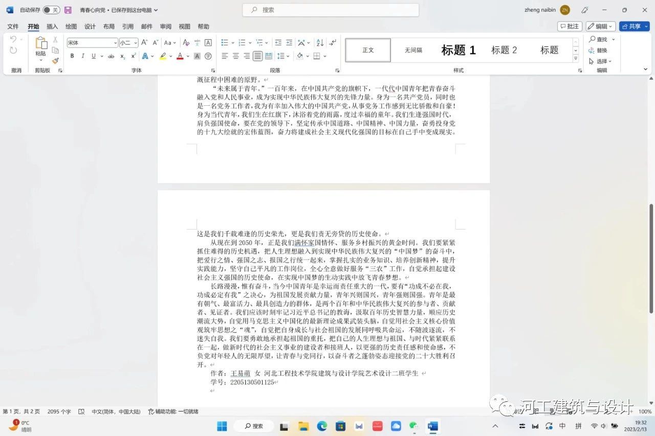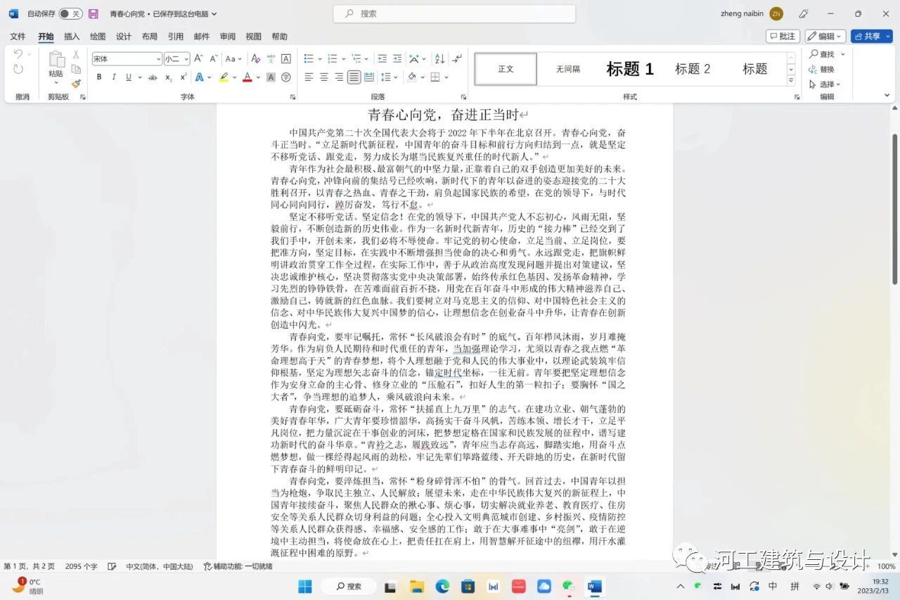 为了让广大建筑公司学子明白青年是祖国的未来、民族的希望,全面贯彻党的二十大精神,宣传习近平总书记关于青少年的关怀,学习党领导中国青年运动的光辉历程,深刻感悟“两个确立”的决定性意义,增强“四个意识”、坚定“四个自信”、做到“两个维持”,为实现实现中华民族伟大复兴的中国梦凝聚起强大青春力量。特此建筑与设计公司团务部于2023年2月1日举办“青春心向党,奋进正当时”主题征文活动。