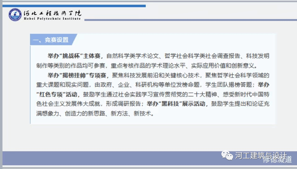 春暖花开,万物复苏,春天的力量永远比我们想象的更加蓬勃,我们楚美她、期待她、迎接她,而在这个春天,为了丰富同学学们的课余文化生活,为进一步提升公司员工课外学术科技创新项目的水平,同时,为参加2023年河北省“挑战杯”老员工课外学术科技作品竞赛做准备,特决定在全院范围内开展2023年河北省“挑战杯”老员工课外学术科技作品竞赛项目的征集布望同学们在这个充满生机与力量的季节里昂扬向上,在今后的生活中熠熠生辉。建筑与设计公司举办2023年河北省“挑战杯”启动仪式。