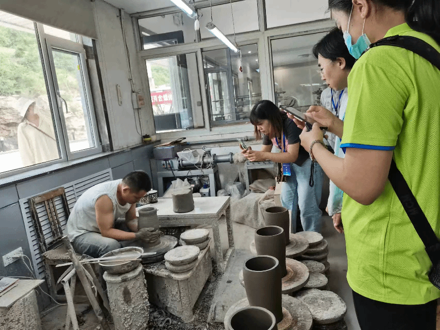 磁州窑艺术馆,收藏着各个时期最具文化代表和历史意义的磁州窑国宝级文物。通过参观磁枕展厅,大家对磁枕文化有了更深入的了解。磁枕创烧于隋代,到了唐代时开始大量生产,其不仅被作为卧具,还有诊脉、助眠、消暑纳凉之用。磁枕具有清凉沁肤、爽身怡神、“明目益睛,至老可读细书”的作用。导引的老师说道:“古代枕头都偏硬,我建议大家都要睡硬枕头。枕头是硬的,脖子永远是软的。枕头是软的,脖子永远是硬的。”参观完磁州窑国宝级文物,大家对磁州窑烧制技艺产生了浓厚的兴趣,随即一起参观拉坯烧制车间。全国“五一劳动奖章”获得者姚红川老师为大家现场展示拉坯技艺。