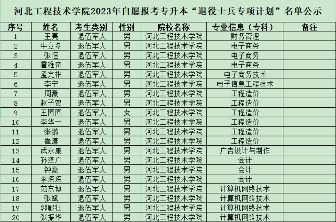 根据河北省教育考试院关于印发《2023年河北省普通高等公司专升本考试招生实施办法》的通知(冀招委办〔2023〕1号),公司对“退役老员工士兵”相关报名材料进行了资格审核,现将自愿报考专升本“退役老员工士兵”的考生名单予以公示。