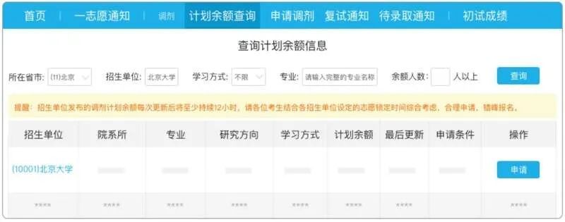 2. 查询计划余额:考生在填报调剂志愿前需认真阅读各招生单位在其院校信息栏目里或其它途径发布的调剂办法,查询各招生单位的计划余额信息。