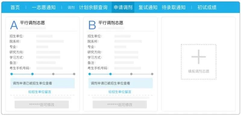 3. 填报调剂志愿:通过调剂系统选择已发布余额的招生单位和专业研究方向,如满足教育部调剂政策且符合招生单位设置的调剂报考条件,可填报调剂志愿(可一次填报三个平行调剂志愿)。提交后的调剂志愿在招生单位设置的时间内(不超过36小时)不允许修改(每个志愿单独计时),以供招生单位下载志愿信息和决定是否通知考生参加复试。锁定时间到达后,考生可继续等待或改报其他志愿。