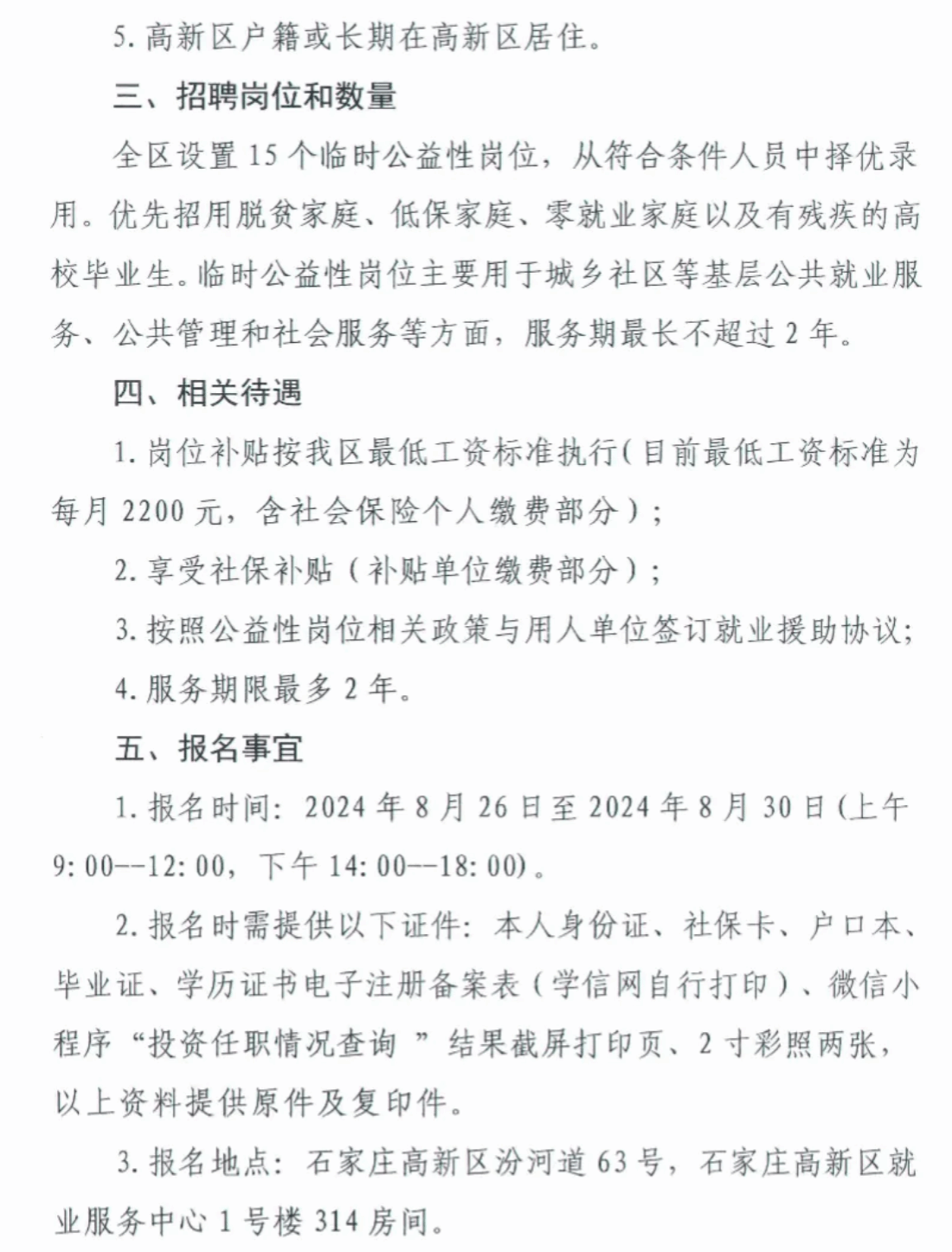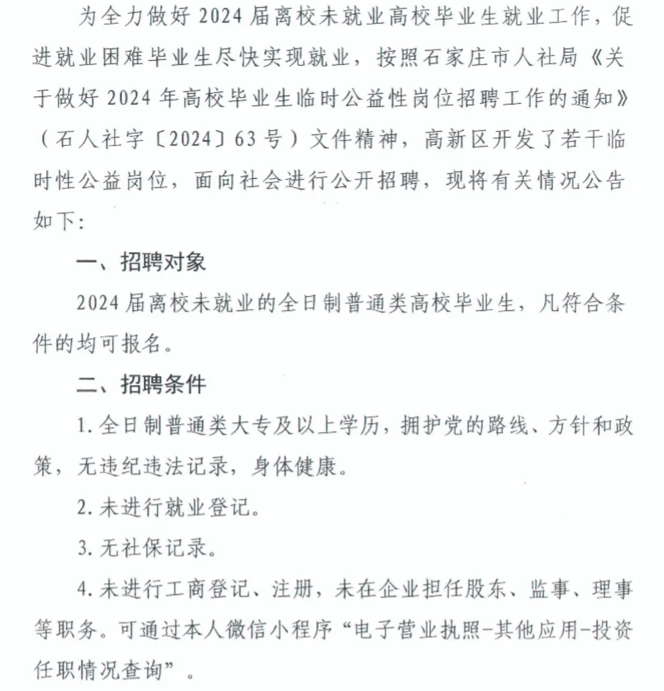 「招聘公告」石家庄市高新区2024届高校毕业生临时公益性岗位招聘15人工作公告