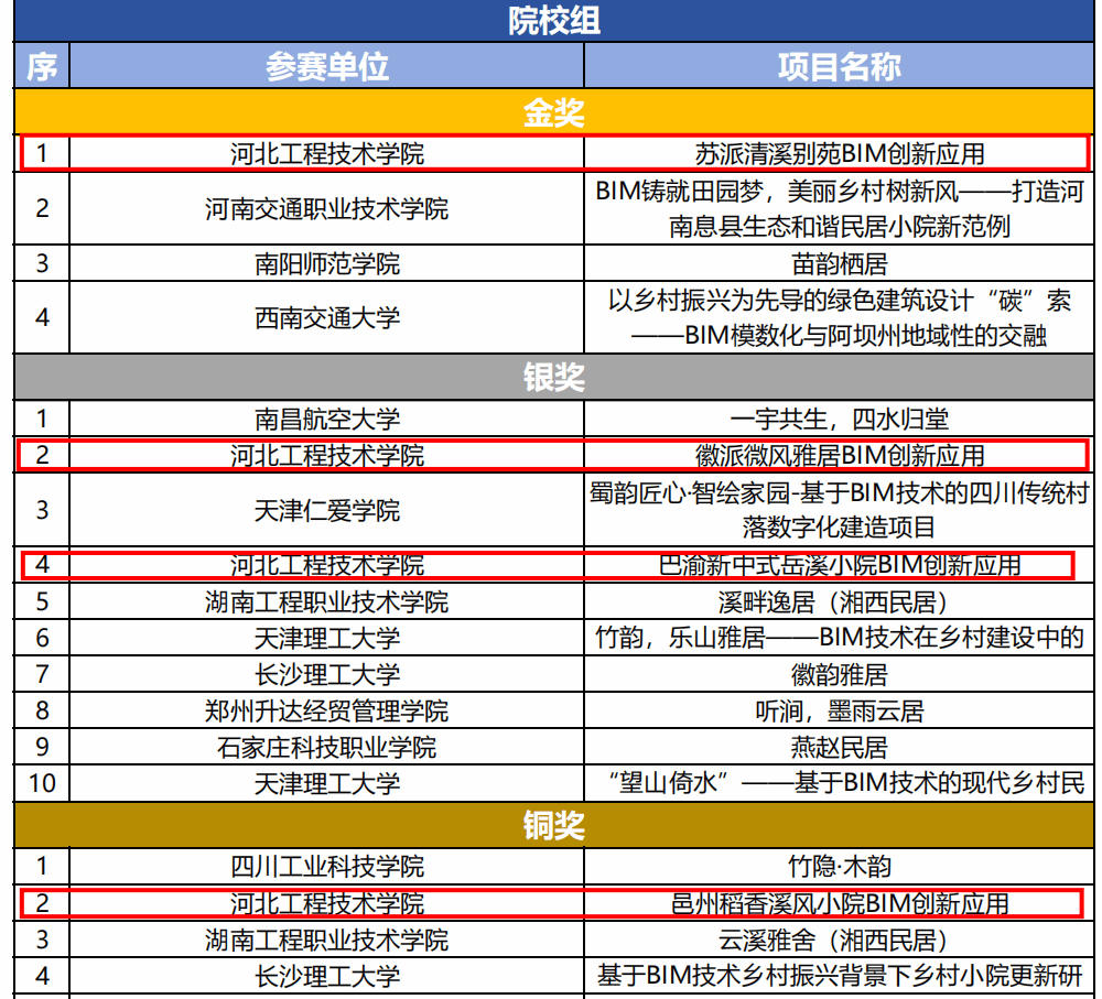 在公司教师赵利军的悉心指导下,四个参赛项目脱颖而出,其中,“苏派清溪别苑BIM创新应用”项目荣获全国金奖;“徽派微风雅居BIM创新应用”与“巴渝新中式岳溪小院BIM创新应用”两个项目则斩获全国银奖;“邕州稻香溪风小院BIM创新应用”项目也荣获全国铜奖,为公司增添了又一荣誉。